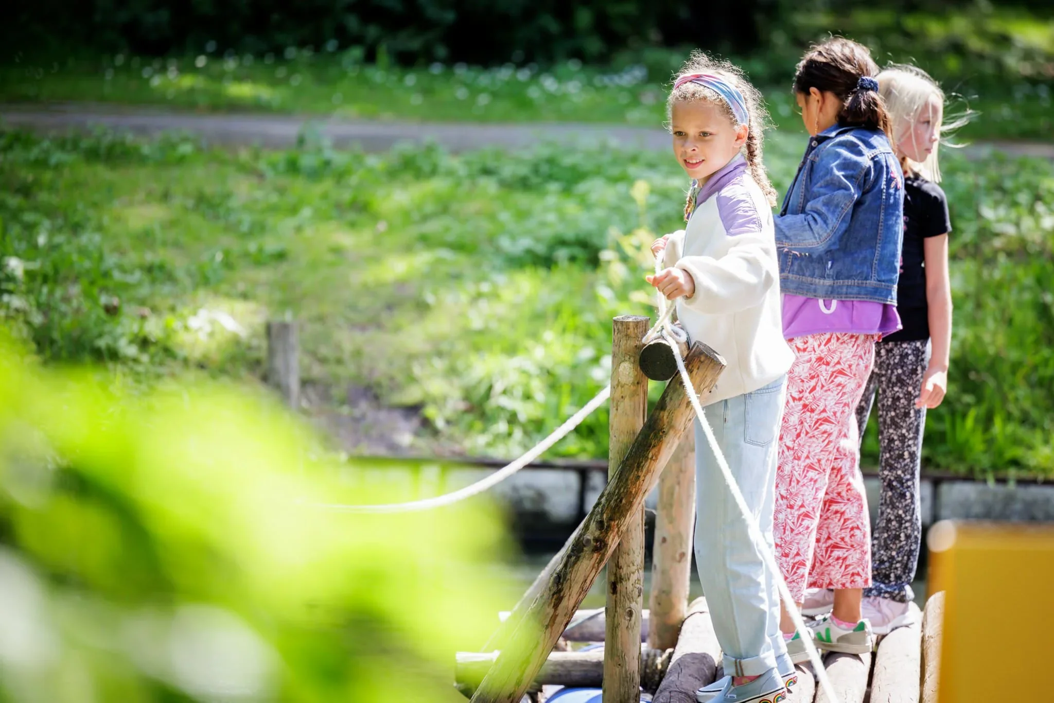 Three young girls walking on a wooden bridge in a lush green park during daytime.