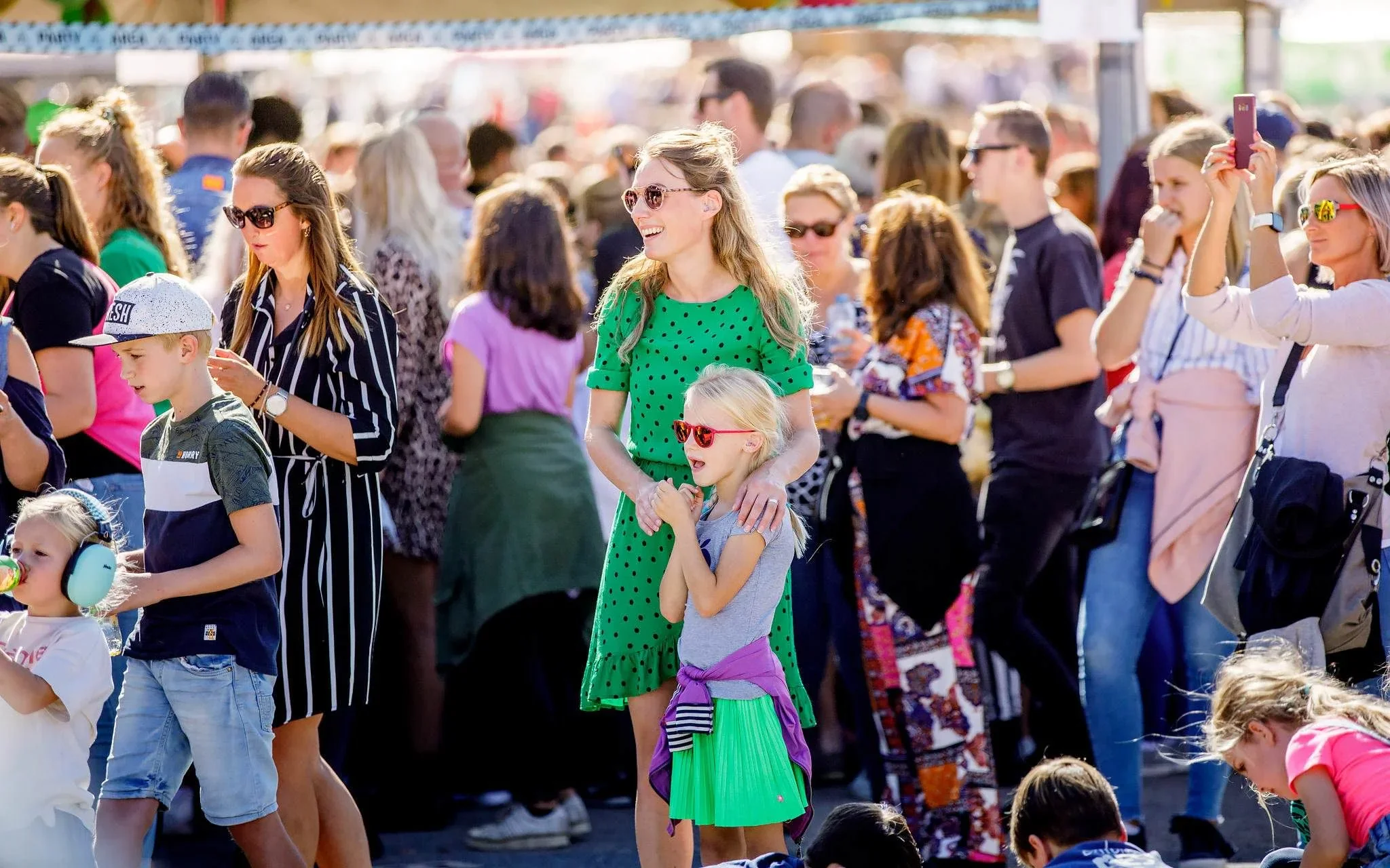 A crowded outdoor event with many people, including children and adults, some taking photos and others walking or standing around, under a blue canopy.