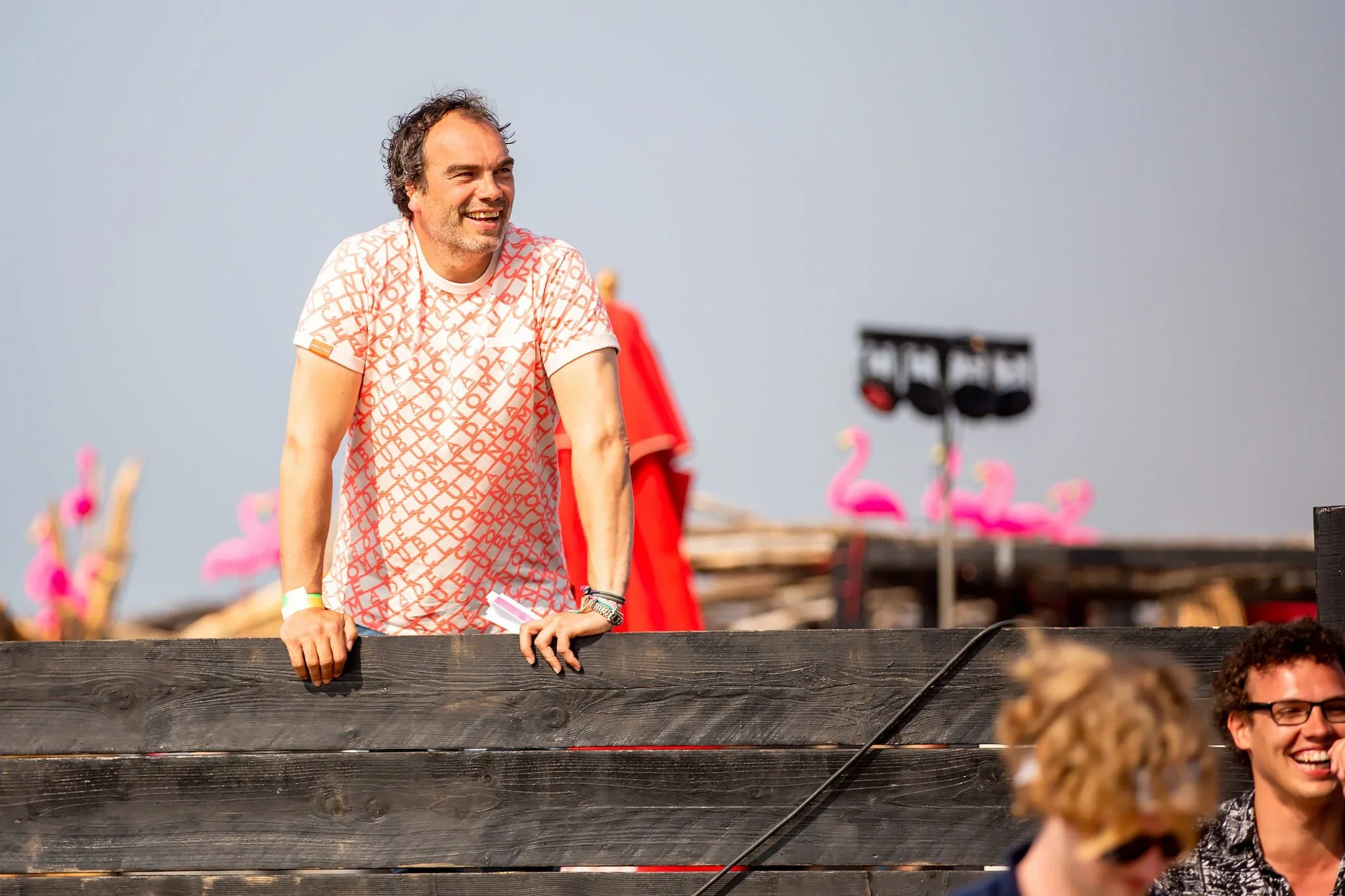 Man with dark curly hair and beard, wearing a white t-shirt with red pattern, leaning on a wooden railing outdoors, smiling, with other people in the background.
