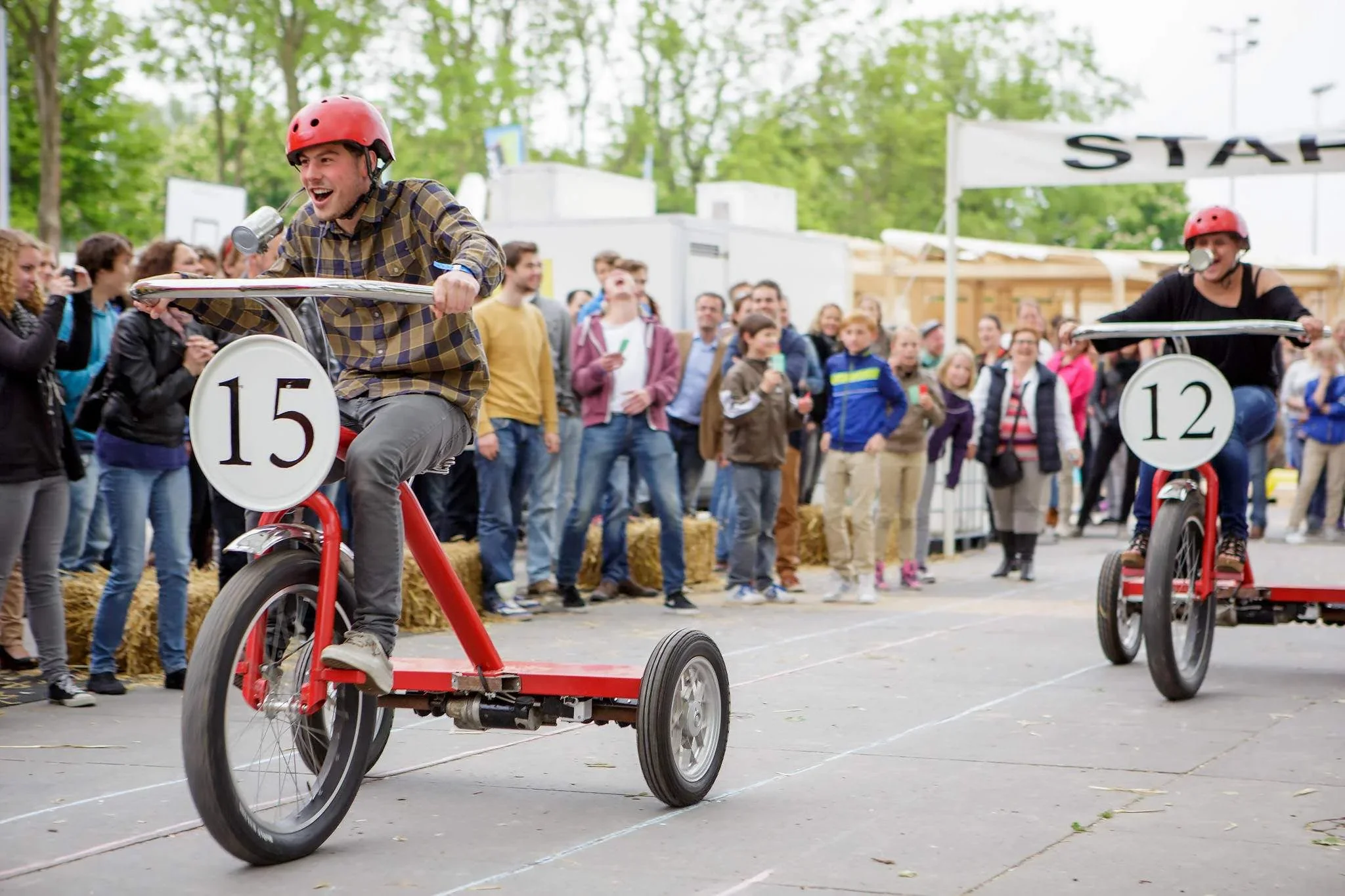 Two people racing on pedal-powered tricycles with numbers 15 and 12, at an outdoor event with a crowd of spectators watching.